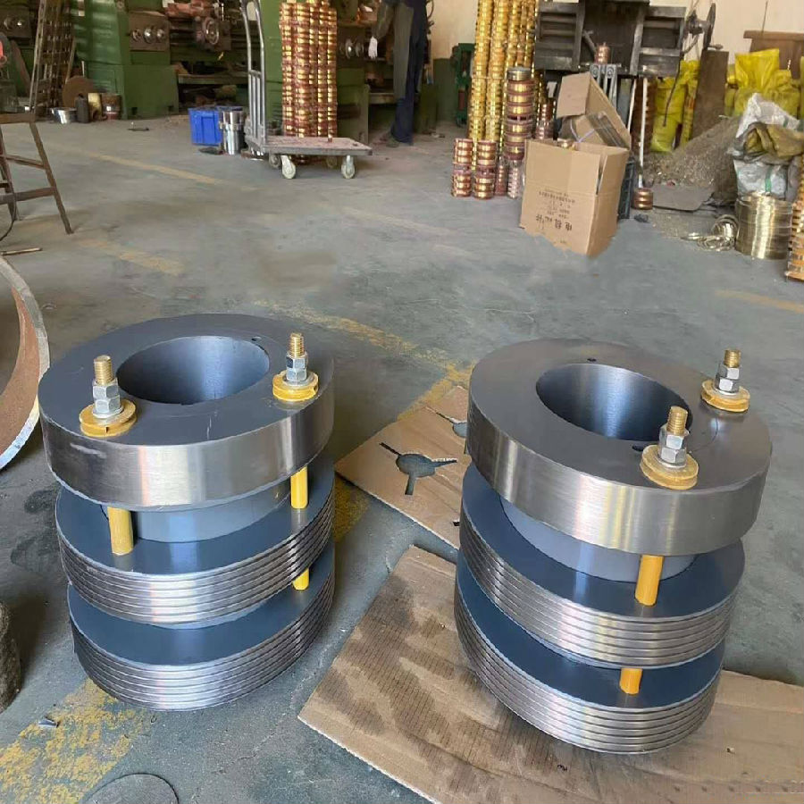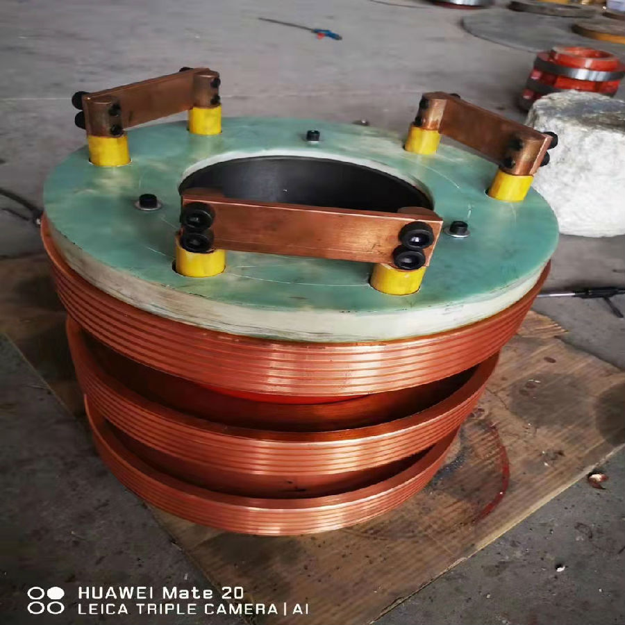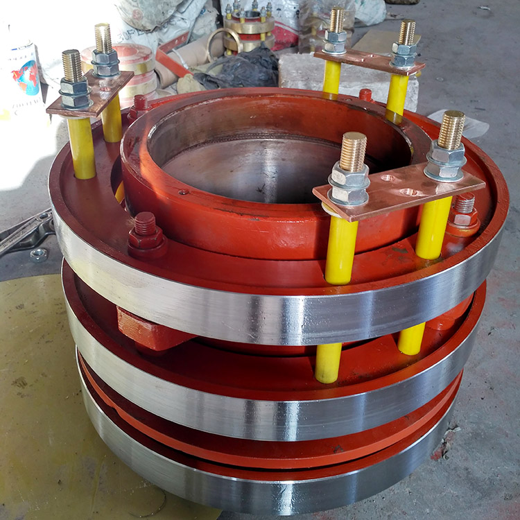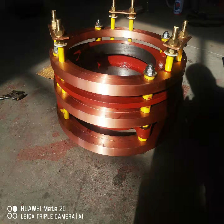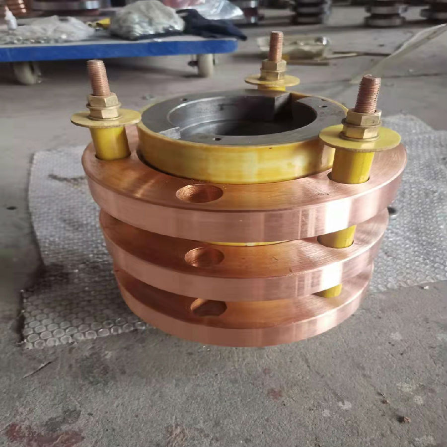集電環(huán)的改造包括:(1)加寬集電環(huán)寬度。現(xiàn)有集電環(huán)寬度為40 mm,將集電環(huán)寬度增加為80 mm。增大集電環(huán)的寬度可以提高集電環(huán)的散熱性能,且有利于碳刷和刷握安裝方式的改造。(2)改集電環(huán)環(huán)面為螺旋溝槽環(huán)面?,F(xiàn)有集電環(huán)環(huán)面均為平面結(jié)構(gòu),容易導(dǎo)致碳刷表面形成微小的氣膜,不利于碳刷和集電環(huán)環(huán)面的充分接觸。集電環(huán)環(huán)面采用螺旋溝槽環(huán)面,增加了集電環(huán)環(huán)面和碳刷之間的透氣性,有利于碳刷與集電環(huán)環(huán)面的充分接觸。這種結(jié)構(gòu)已經(jīng)在三峽機(jī)組和葛洲壩增容機(jī)組上得到成功應(yīng)用。(3)增加上下集電環(huán)的間距?,F(xiàn)有集電環(huán)間距為55mm,將集電環(huán)間距增加到100mm。增加集電環(huán)間距的主要目的在于防止機(jī)組突然抬機(jī)和機(jī)組振動導(dǎo)致上下集電環(huán)之間短路,減小集電環(huán)環(huán)面燒蝕的概率。